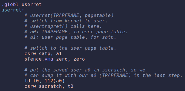 调用函数fn(),函数入口地址是userret,两个参数TRAPFRAME, satp被保存到a0,a1, 进入userret。