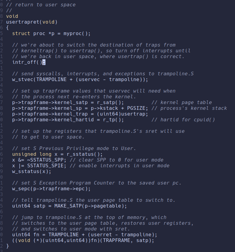 现在我们进入了usertrap函数,在这里面进行中断的处理操作,不是关注的重点我们就跳过了。直接看usertrapret函数。